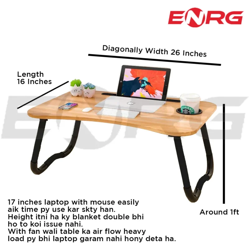 • ENRG Wooden Gaming Laptop Table with fan high speed dual and single For Bed Foldable Laptop Stand Ergonomic Portable Table For Laptop Drawing Bed Notebook Reading Food Breakfast Serving With Inbuild Tablet And Cup Holder Slots For Bed Couch – Black Wooden Brown Pink Yellow Green White Blue